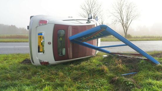 Auto rijdt tegen plaatsnaambord langs afrit A32 en kantelt